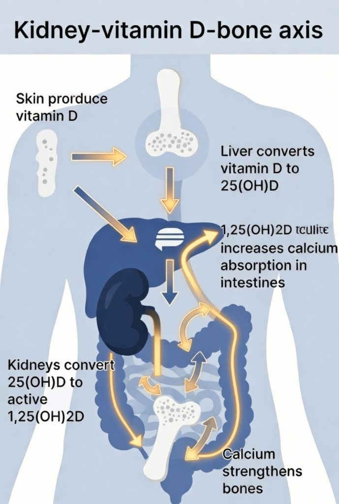🔹הפעלת ויטמין D: הכליות ממירות ויטמין D לצורתו הפעילה (1,25-דיהידרוקסי ויטמין D, או קלציטריול). צורה זו מגבירה ספיגת סידן במעיים ומסייעת בשמירה על רמות סידן גבוהות בדם, מה שמפחית את הצורך בשחרור סידן מהעצמות. ללא תפקוד כלייתי תקין, רמות ויטמין D הפעיל יורדות, מה שמוביל לבריחת סידן גדולה יותר [מקור1, מקור2, מקור3].