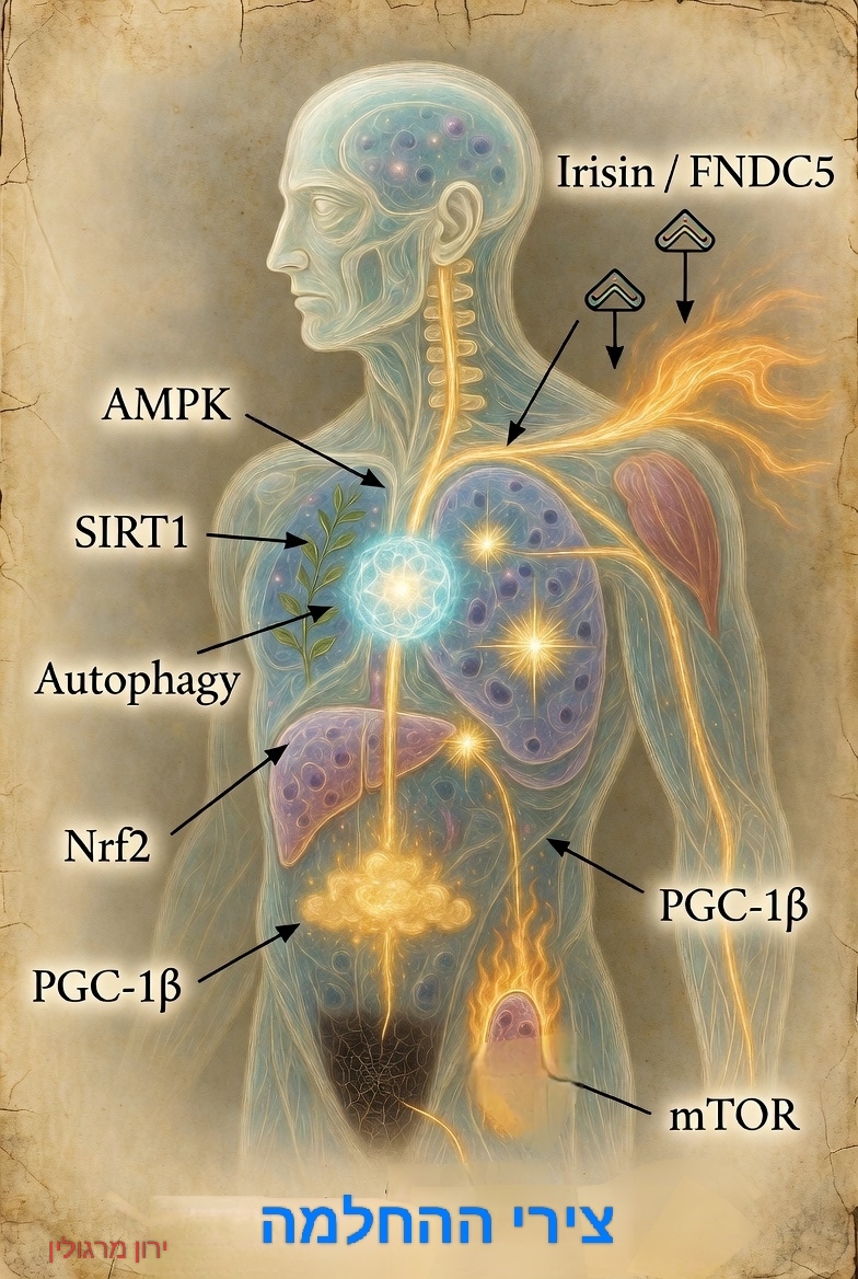 הגוף פועל להחלמה ותיקון באופן מתמשך. הוא פועל דרך רשת של צירים מרכזיים שמקשרים בין הזנה, אנרגיה תאית, ניקוי תאי, ייצור מיטוכונדריה, ניהול דלקת והגנה מפני נזק חמצוני. הצירים העיקריים שאזכיר — AMPK, SIRT1, Autophagy (אוטופגיה), גם FNDC5/איריזין, Nrf2, TFEB, PGC-1α ו-mTOR — הם הצירים המרכזיים המהלכים "המנצחים" של הסימפוניה הזו. הצירים האלו כמעט מוזנחים לגמרי וזאת משום שהם למעשה לא נמדדים ישירות בשגרה הקלינית (אין בדיקת דם סטנדרטית ל-AMPK פעיל או לרמת אוטופגיה), אבל הם משאירים טביעות אצבע ברורות בבדיקות שכן זמינות.