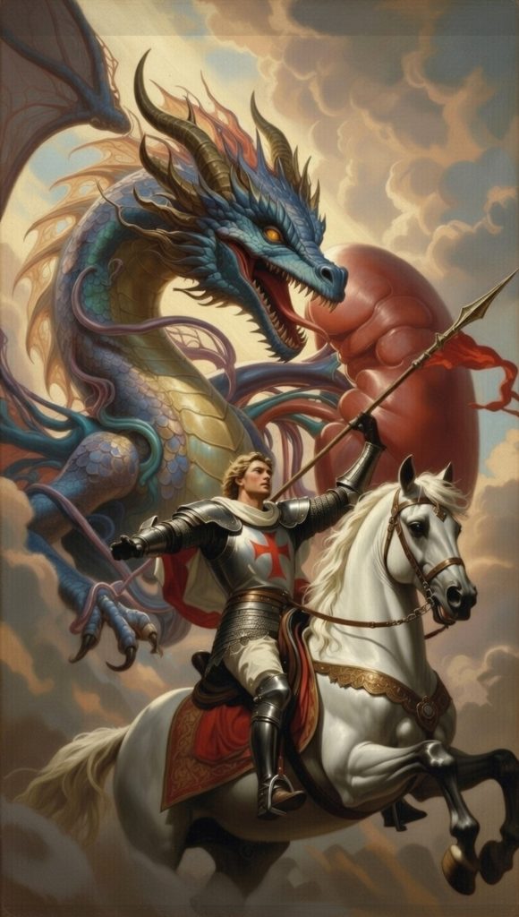 באיור למעלה הקדוש ג'ורג' מנסה להציל את הכליה שנלכדה במלתעות הדרקון במכה אחת. ירון מרגולין בעזרת Grok