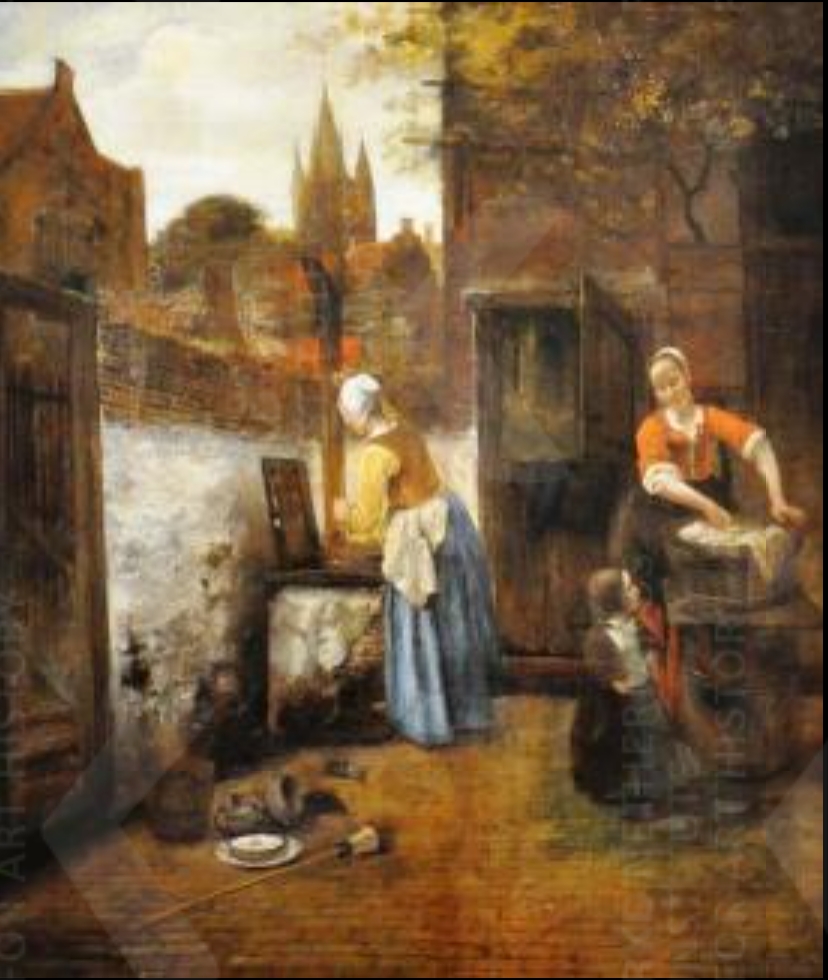 Courtyard with an Arbour, בחצר עם ארבור, משנת 1658, אישה שותה עם שני גברים [A Woman Drinking with Two Men (1658)]', שמן על בד,ע"פ הצייר ההולנדי פיטר דה הוך, פגם, מידות: 31X25 ס"מ. דה הוך, מתאר כאן חצר של בית הולנדי -1658 אבל ואולי גם הפעם מככב הנושא 'העדר מוסר'. האישה שותה אלכוהול עם שני בחורים שמפתים אותה נוכח כנסיה – שמציצה מעבר לגדר ושופטת אותם כנראה גם הצייר.