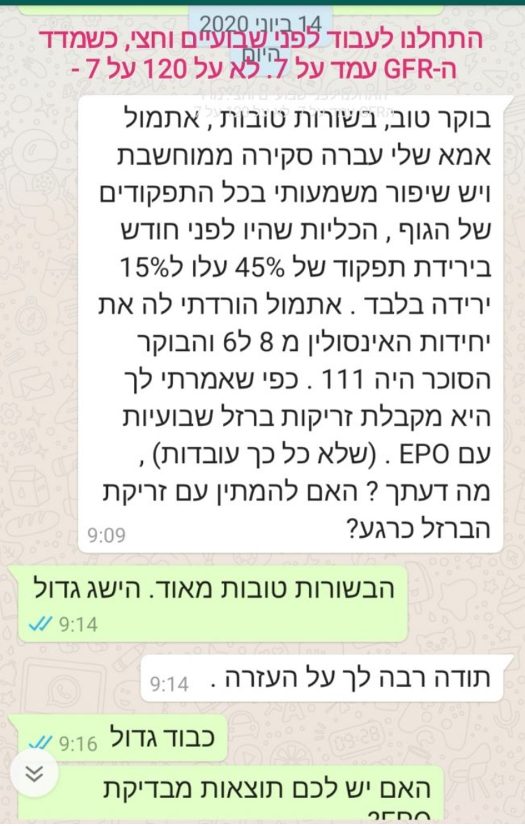 שלום ירון , מצרף לעיונך את הבדיקות האחרונות שביצעתי לפני יומיים. מה דעתך? אני מאוד מרוצה לראות את השינויים לטובה בכל המדדים שתוקנו: קריאטינין, אוראה, גלוקוז GFR. תודה מקרב לב. רופאת המשפחה התקשרה אלי היום ונשארה פעורת פה וזה עודד אותי מאוד. הילדים עוד לא יודעים כי כולם עסוקים, נחכה לסוף שבוע למפגש המשפחתי… הגיע מחלים כליה הוואטסאפ.