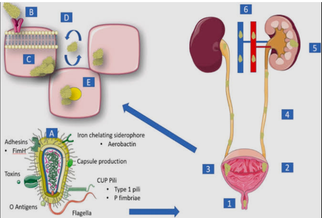 מערכת השתן – מימין: המספרים 1 עד 6 מציינים חלקים שונים במערכת השתן: שופכה (1), שלפוחית השתן (3), שופכנים (4) וכליות (5, 6). האיור מדגים חיידק ה-E.coli: על גוון גורמי ארסיות, כולל אדהזינים (FimH, CUP Pili, Type 1 pili, P fimbriae), יצירת קפסולה, טוקסינים, ושוטון הוא התארכות של קרום התא – פלגלה (Flagella) [מקור1, מקור2].
