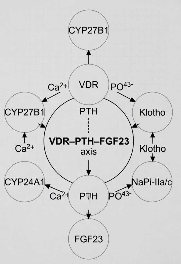 הציר "כליה–VDR–PTH–FGF23" מתאר לולאת משוב מכרעת המווסתת את חילוף החומרים של סידן, פוספט וויטמין D, כאשר קולטן ויטמין D (VDR) נקשר לוויטמין D פעיל כדי להשפיע על FGF23 (גורם גדילה פיברובלסטי 23) ו-PTH (הורמון פרתירואיד). הפעלת VDR מקדמת ייצור FGF23, אשר מוריד את רמות הפוספט והוויטמין D הפעיל, בעוד ש-PTH מגרה את הפעלת ויטמין D אך מדוכא על ידי FGF23, ויוצר אינטראקציה מורכבת השומרת על איזון מינרלים, החיוניים במיוחד לבריאות הכליות.