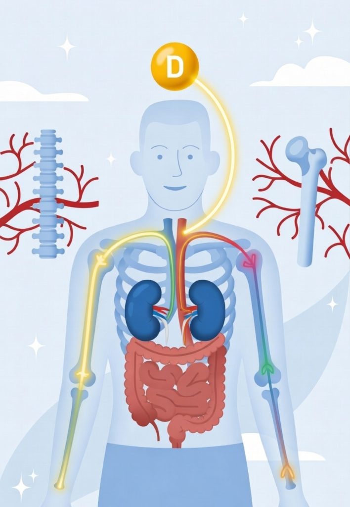 🔹הפעלת ויטמין D: הכליות ממירות ויטמין D לצורתו הפעילה (1,25-דיהידרוקסי ויטמין D, או קלציטריול). צורה זו מגבירה ספיגת סידן במעיים ומסייעת בשמירה על רמות סידן גבוהות בדם, מה שמפחית את הצורך בשחרור סידן מהעצמות. ללא תפקוד כלייתי תקין, רמות ויטמין D הפעיל יורדות, מה שמוביל לבריחת סידן גדולה יותר [מקור1, מקור2, מקור3].
