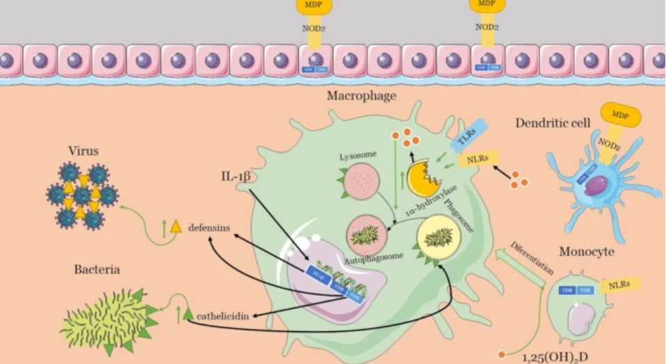 ויטמין D משתתף במסלולי איתות מורכבים דרך קולטנים כמו TLRs (Toll-like receptors) ו-NLRs (NOD-like receptors) כדי לתאם את התגובה החיסונית [מקור].