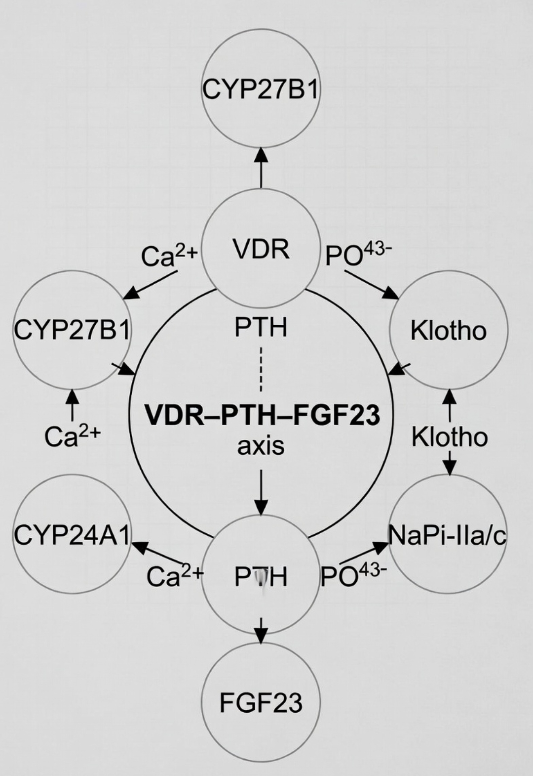 הציר "כליה–VDR–PTH–FGF23" מתאר לולאת משוב מכרעת המווסתת את חילוף החומרים של סידן, פוספט וויטמין D, כאשר קולטן ויטמין D (VDR) נקשר לוויטמין D פעיל כדי להשפיע על FGF23 (גורם גדילה פיברובלסטי 23) ו-PTH (הורמון פרתירואיד). הפעלת VDR מקדמת ייצור FGF23, אשר מוריד את רמות הפוספט והוויטמין D הפעיל, בעוד ש-PTH מגרה את הפעלת ויטמין D אך מדוכא על ידי FGF23, ויוצר אינטראקציה מורכבת השומרת על איזון מינרלים, החיוניים במיוחד לבריאות הכליות.