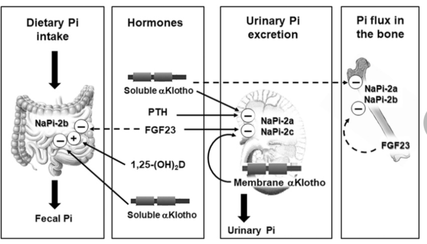 לפניך תרשים של פונקציות פיזיולוגיות של גורם צמיחה פיברובלסט 23 – Pi חיוני לתפקודים ביולוגיים רבים, כולל מטבוליזם אנרגיה, איתות תוך-תאי, הרכב מבני של רכיבים תאיים רבים ומינרליזציה של העצם. איזון הפוספט Pi נשמר על ידי זרם וזרם דרך המעיים, הכליות, העצם והרקמה הרכה, הכוללים מעבירי תנועה מרובים של נתרן / פוספט (Na + / Pi), כמו גם ויסות על ידי מספר הורמונים. שינויים ברמות הפוספט החוץ-תאי משפיעים על רקמות השלד ועל רקמות חוץ-שלדיות, וראיות מצטברות הראו כי הפוספט עצמו מעורר התמרה של אות כדי להסדיר את ביטוי הגנים והתנהגות התאים. הומיאוסטזיס של פוספט (Pi), מוסדר על ידי יחסי גומלין מתואמים של איברים שונים, כולל מעיים, כליות ועצם, ורשתות אנדוקריניות המורכבות מ- PTH, 1,25- (OH) 2D, FGF23 ו-נושא מרכזי במאמר זה: Alpha-Klotho (αKlotho) (החלבון αKlotho הטרנסממברני – מתבטא בעיקר בצינוריות מפותלות דיסטליות בכליות ברמות נמוכות יותר בצינוריות מפותלות פרוקסימליות, ובתאים ראשיים של בלוטת התריס, מה שהופך את הכליה ובלוטת התריס לאיבר היעד העיקרי FGF23 למטבוליזם מינרלי [מקור1, מקור2, מקור3].). מקור הרישום בצילום מסך מהמאמר "Role of αKlotho and FGF23 in Regulation of Type II Na-dependent Phosphate Co-transporters" – כאן