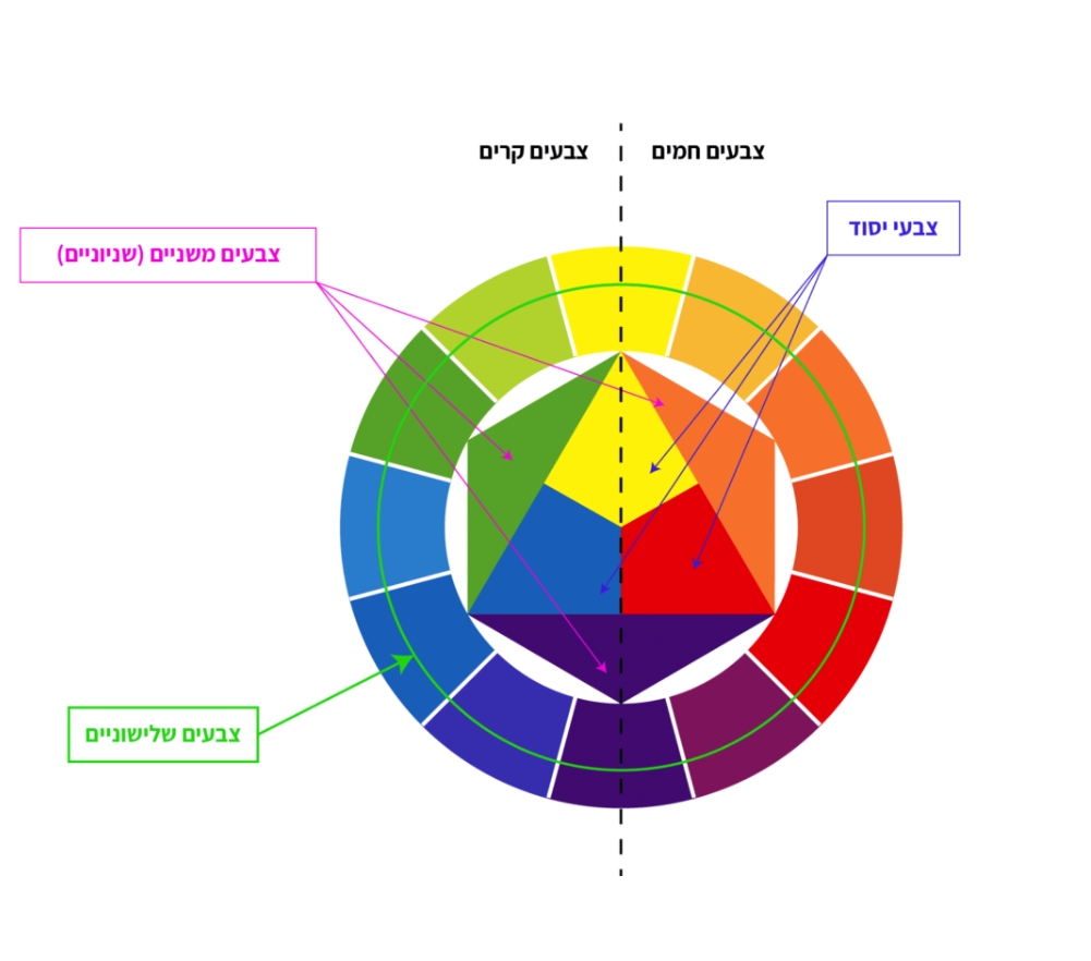2.. ישנם 3 צבעים מנוגדים שנוצרים מערבוב של שני צבעי יסוד, ומנוגדים לצבע היסוד השלישי.
