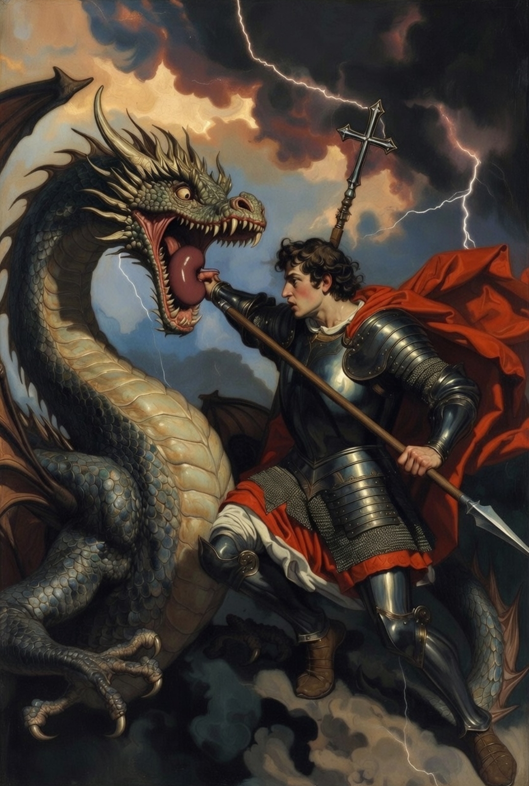 באיור למעלה הקדוש ג'ורג' מנסה להציל את הכליה שנלכדה במלתעות הדרקון במכה אחת. ירון מרגולין בעזרת Grok