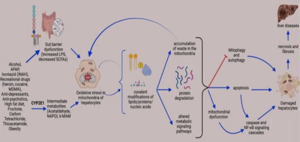 גורמים כמו אלכוהול, תרופות מסוימות, סמים, תזונה עשירה בשומן וסוכר, והשמנה, יכולים לגרום ללחץ חמצוני במיטוכונדריה של תאי הכבד.