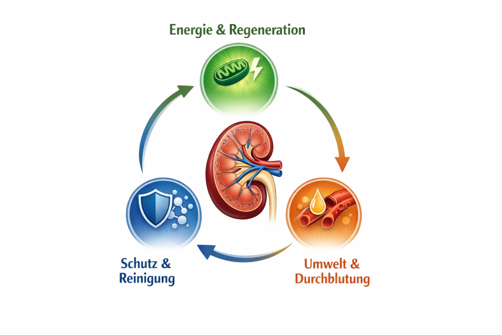 Ein ergänzender Blickwinkel besteht darin, die Niere nicht nur als filtrierendes Organ zu betrachten, sondern als Teil eines komplexen biologischen Systems, das auf Energie, Durchblutung, Sauerstoffverfügbarkeit und zelluläre Erneuerung angewiesen ist.