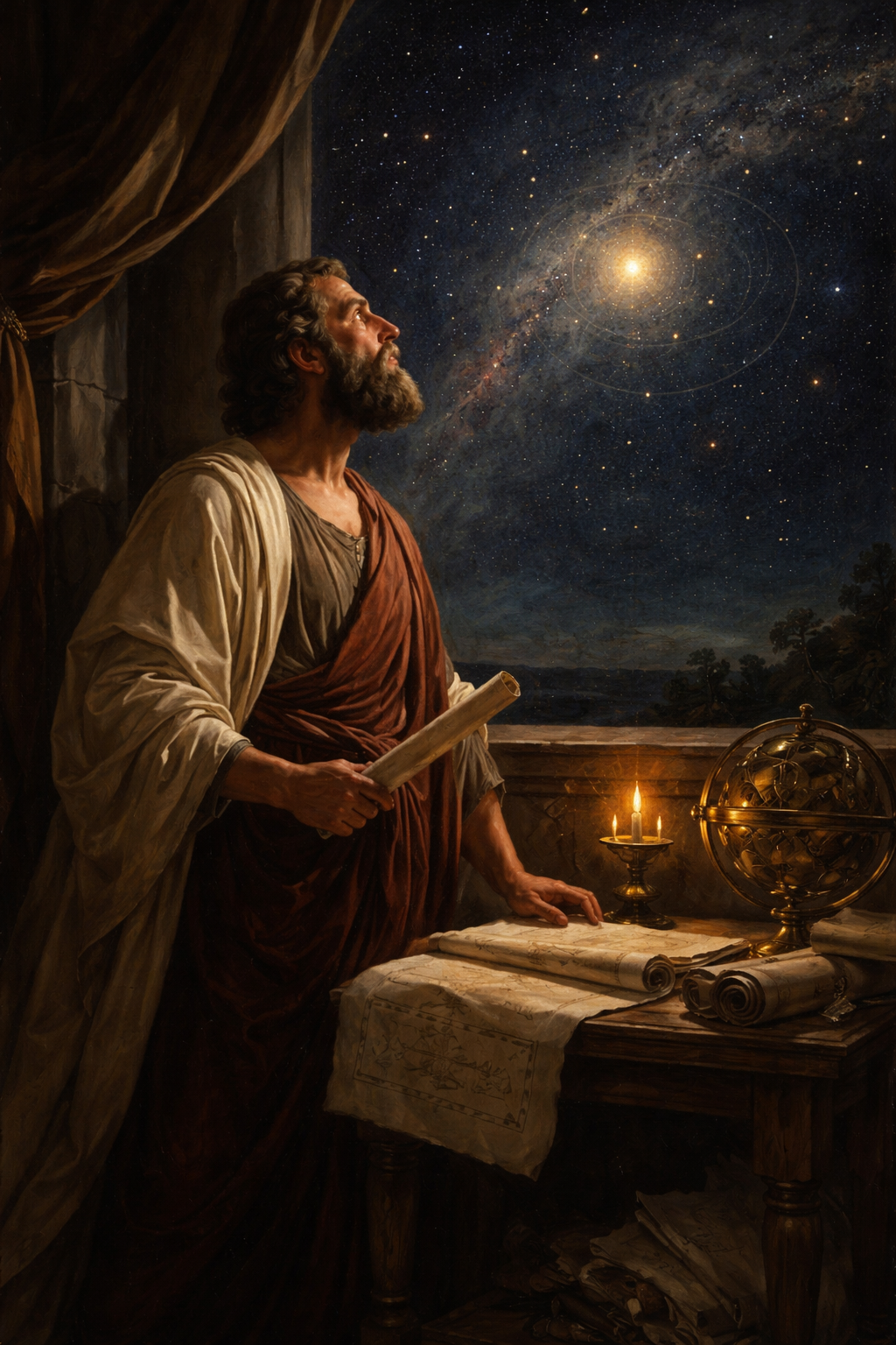 במאה השלישית לפנה"ס, כשהעולם כולו — בהנהגת אריסטו ואחרים — האמין שהארץ עומדת במרכז היקום, אריסטרכוס העז להסתכל על הנתונים ולומר: "השמש היא במרכז, וכדור הארץ סובב סביבה". הוא לא רק העלה השערה — הוא בנה מודל הליוצנטרי שלם, כולל הערכות של גודל השמש והמרחקים.